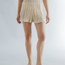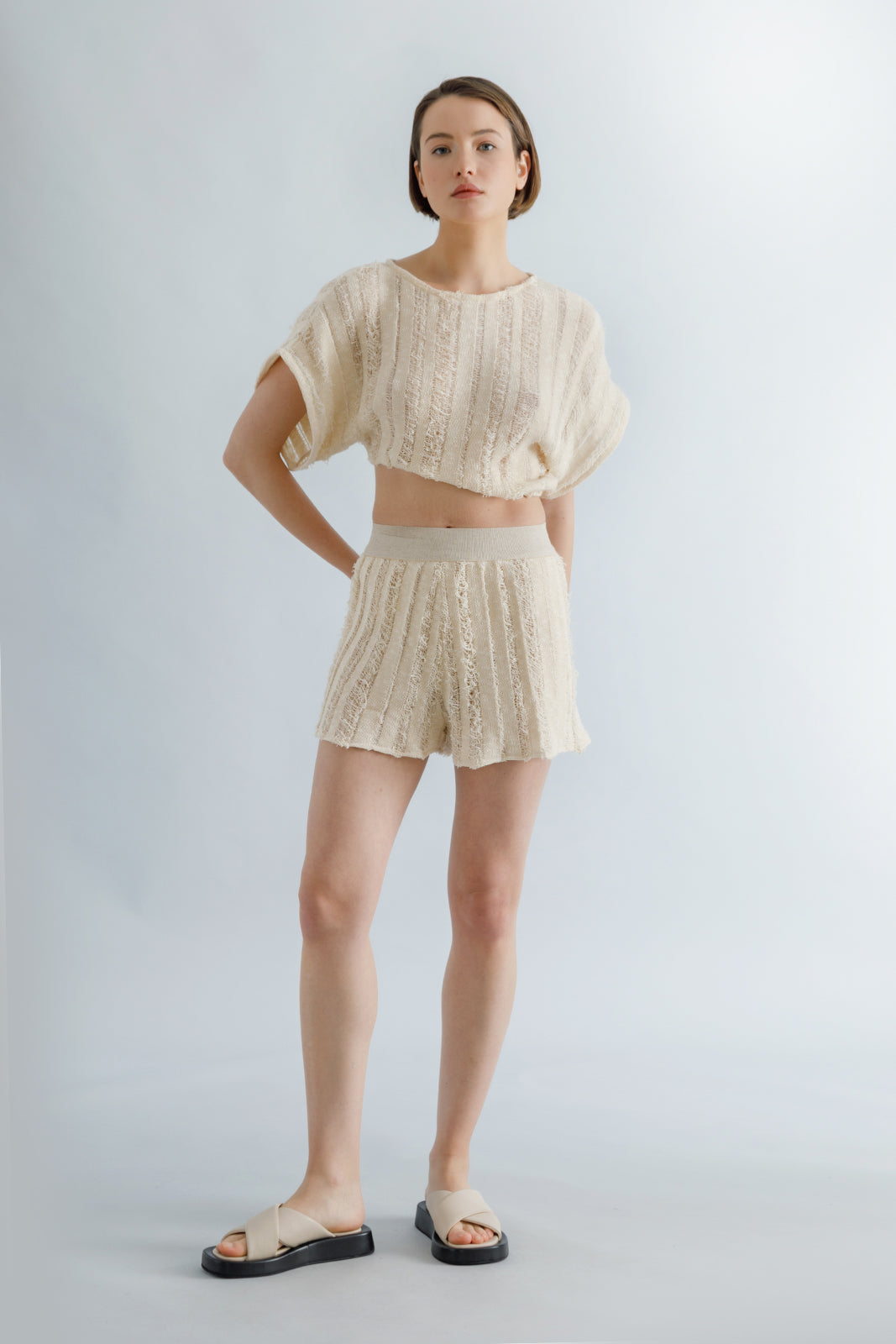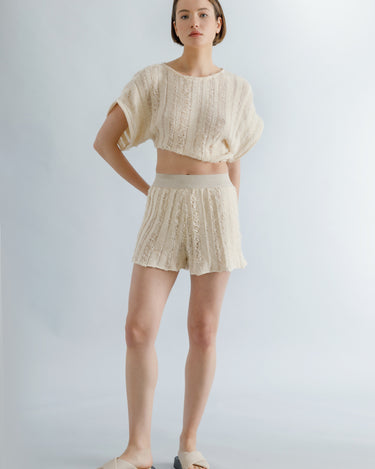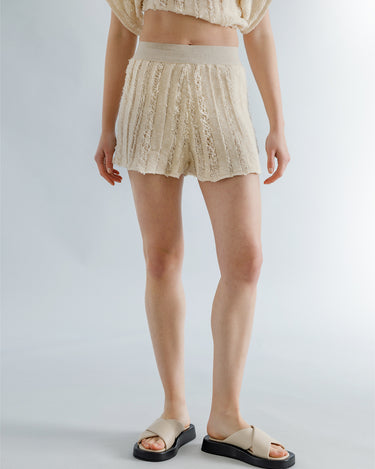 Open knit shorts featuring yellow, cotton blend, open knit, elasticated and thigh-length.
