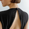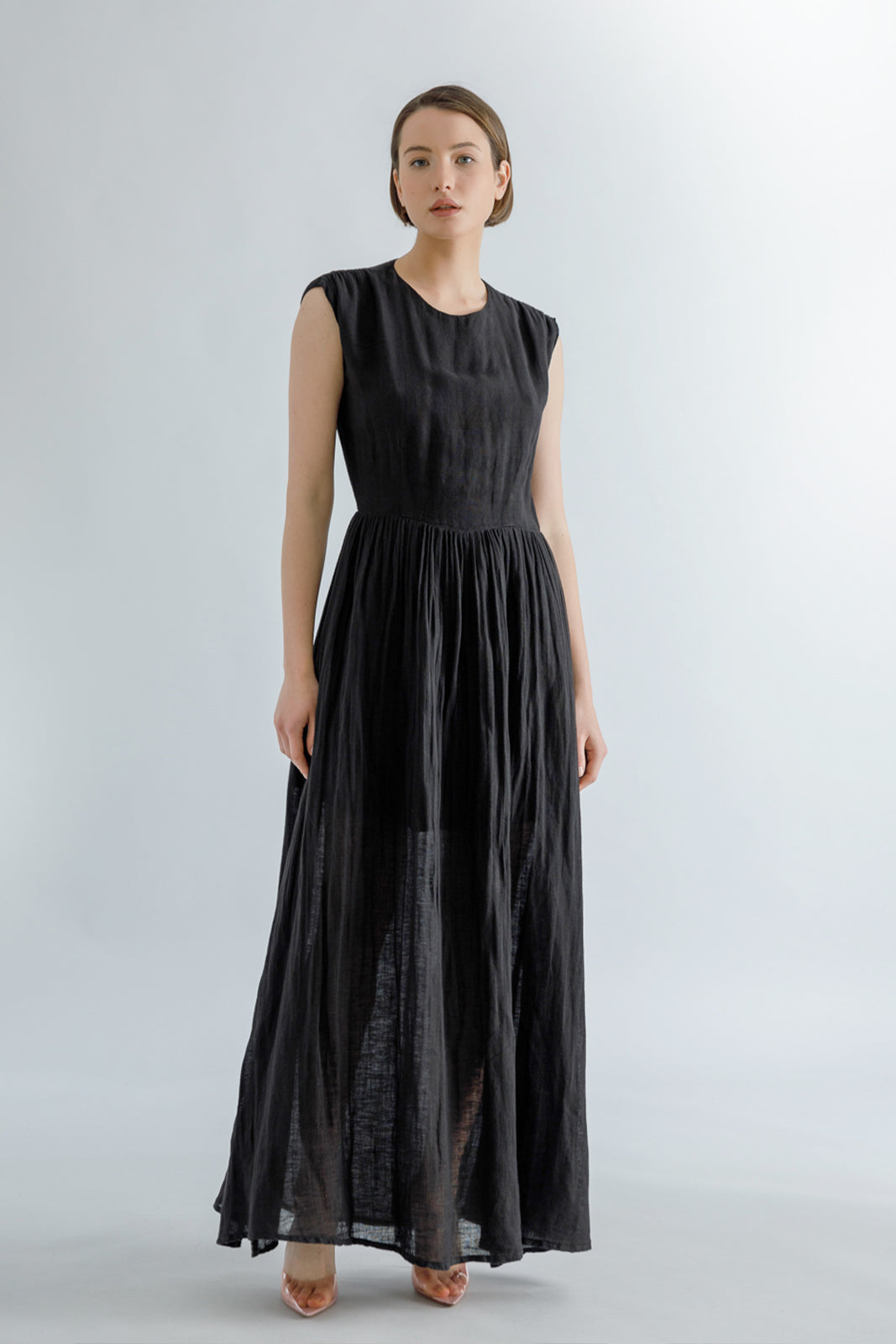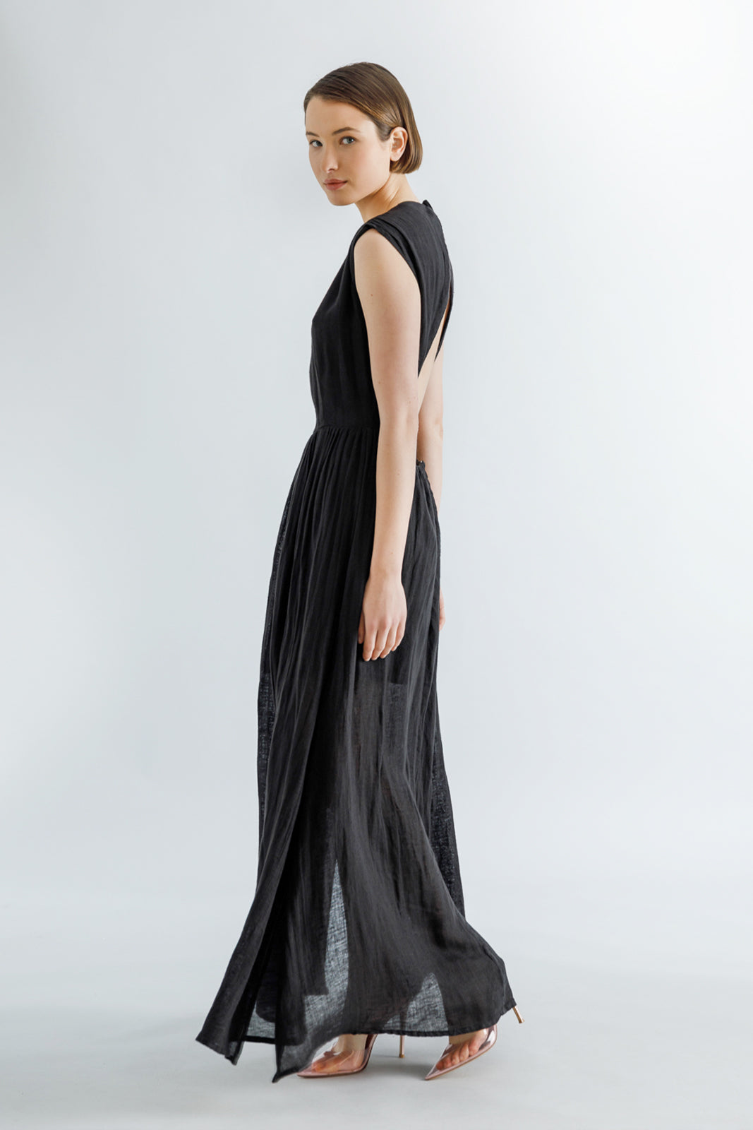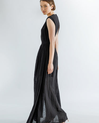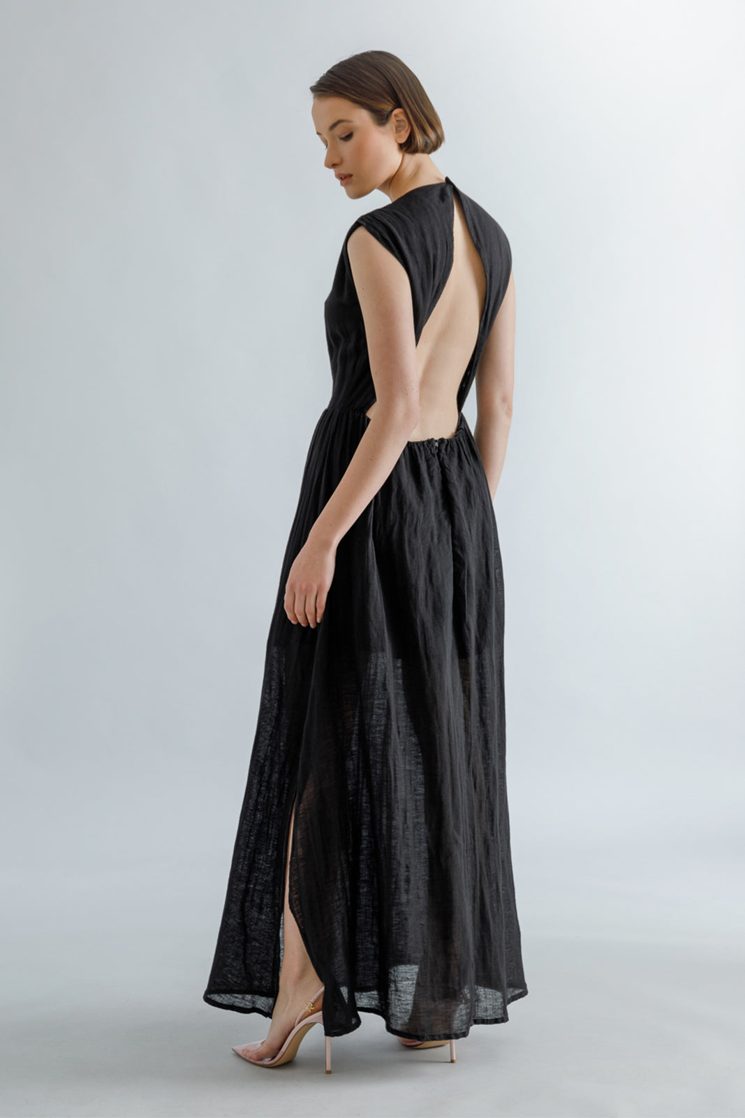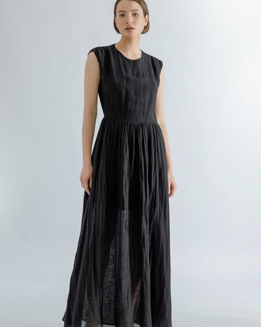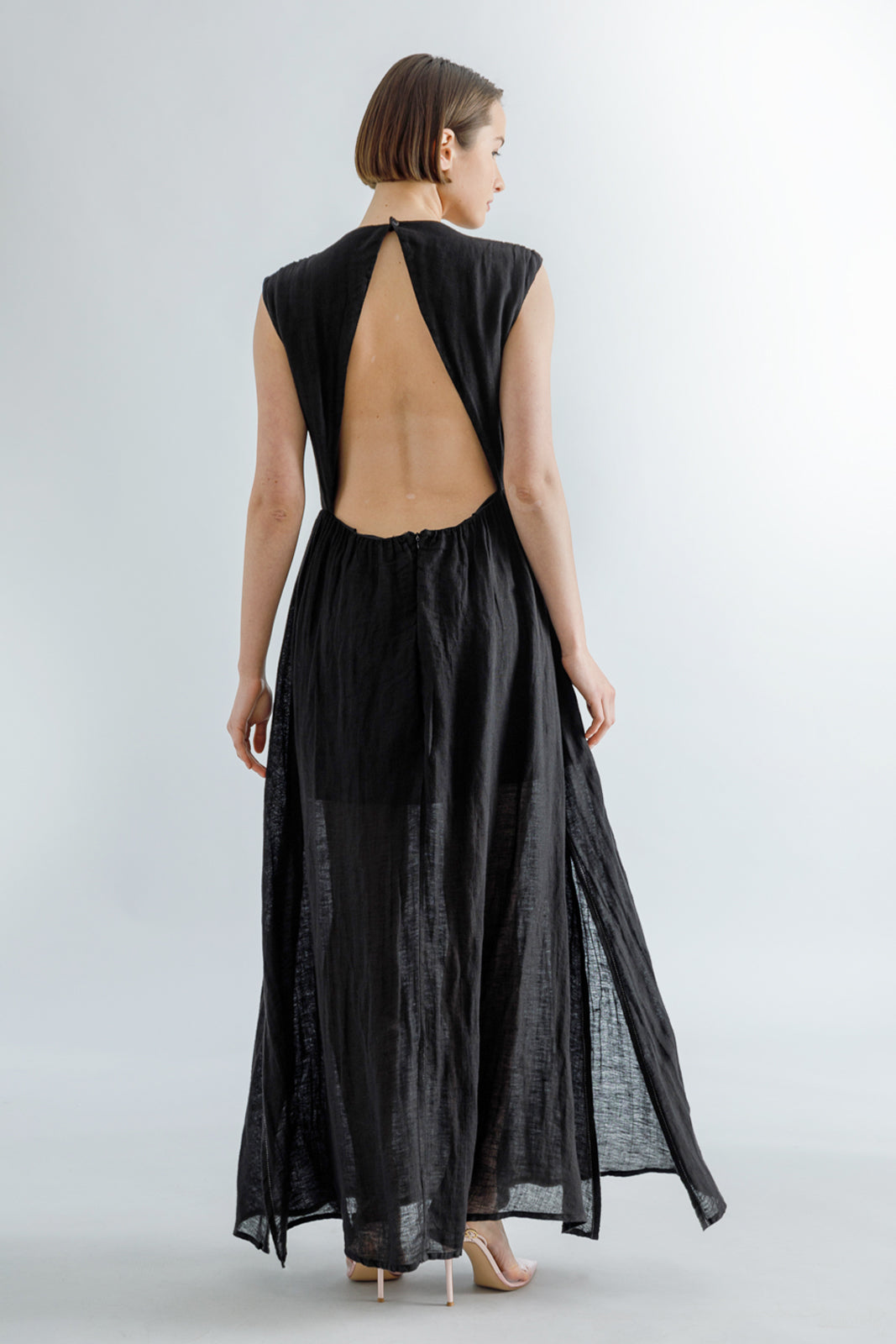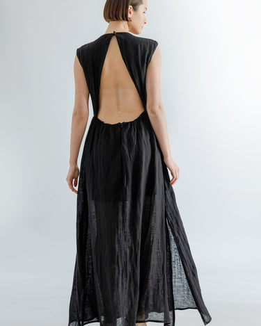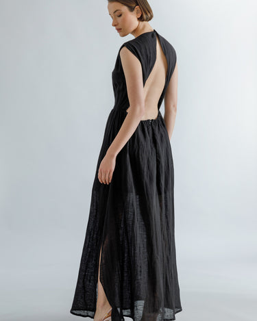 Black linen blend open-back maxi dress, round neck, fitted waistline and A-line skirt.