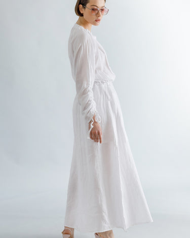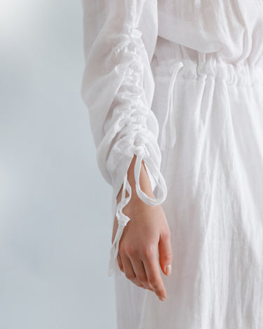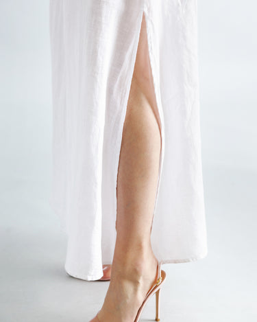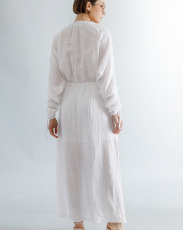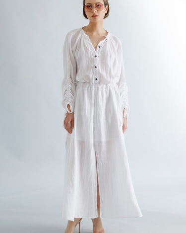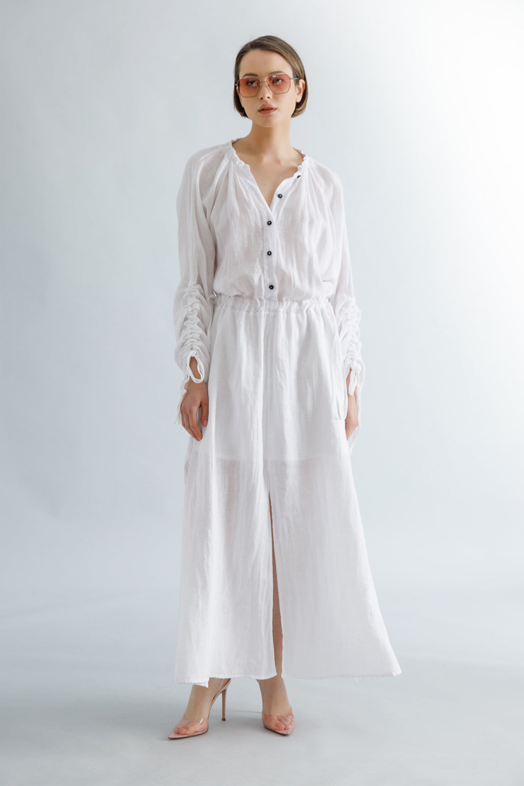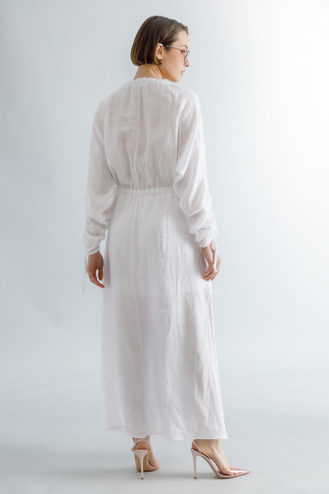 Bomber maxi dress from ATHOA featuring white, linen/flax, long sleeves and side slits.