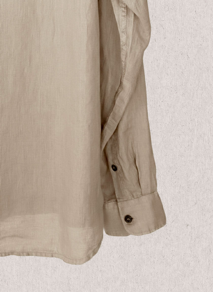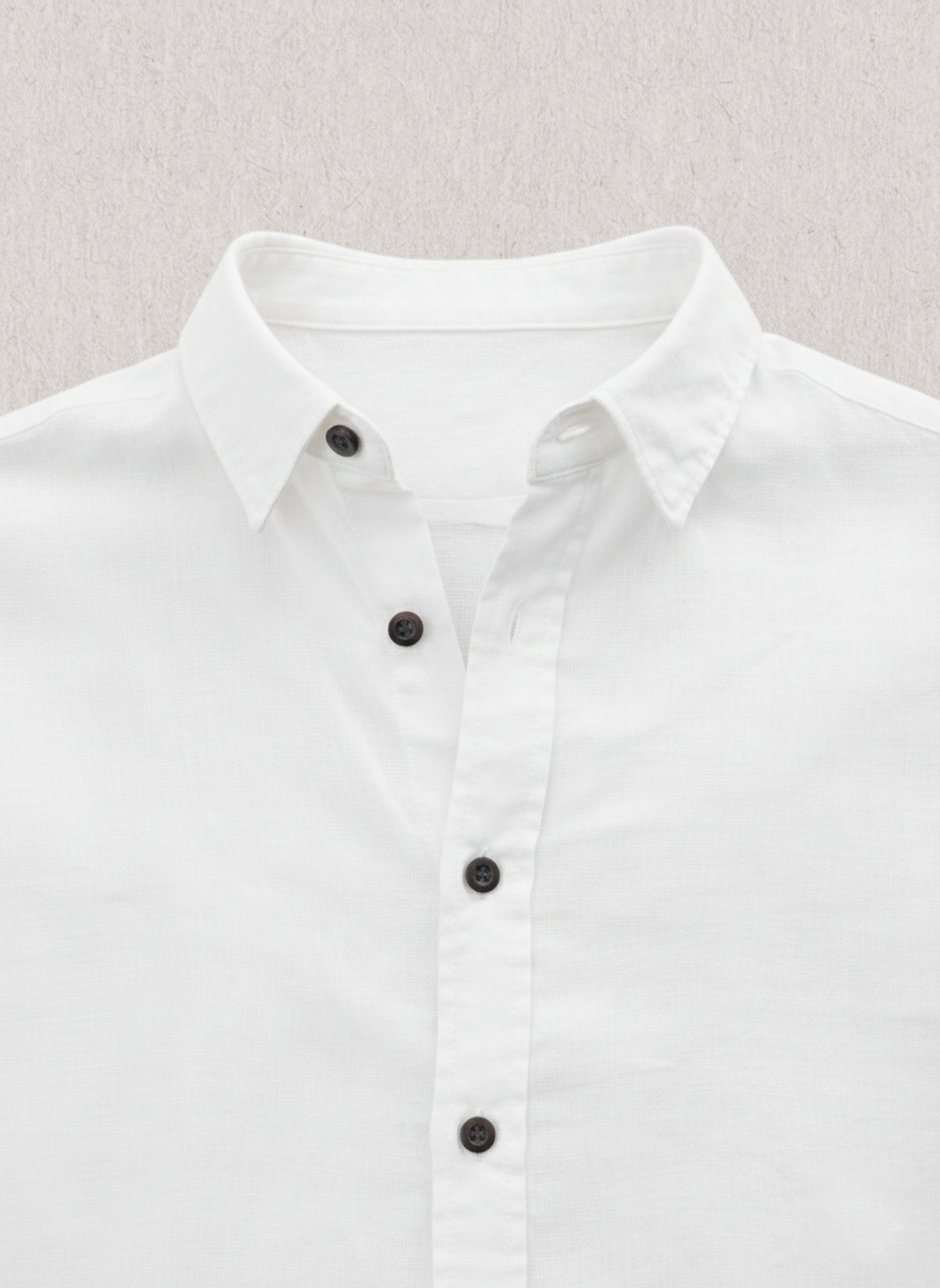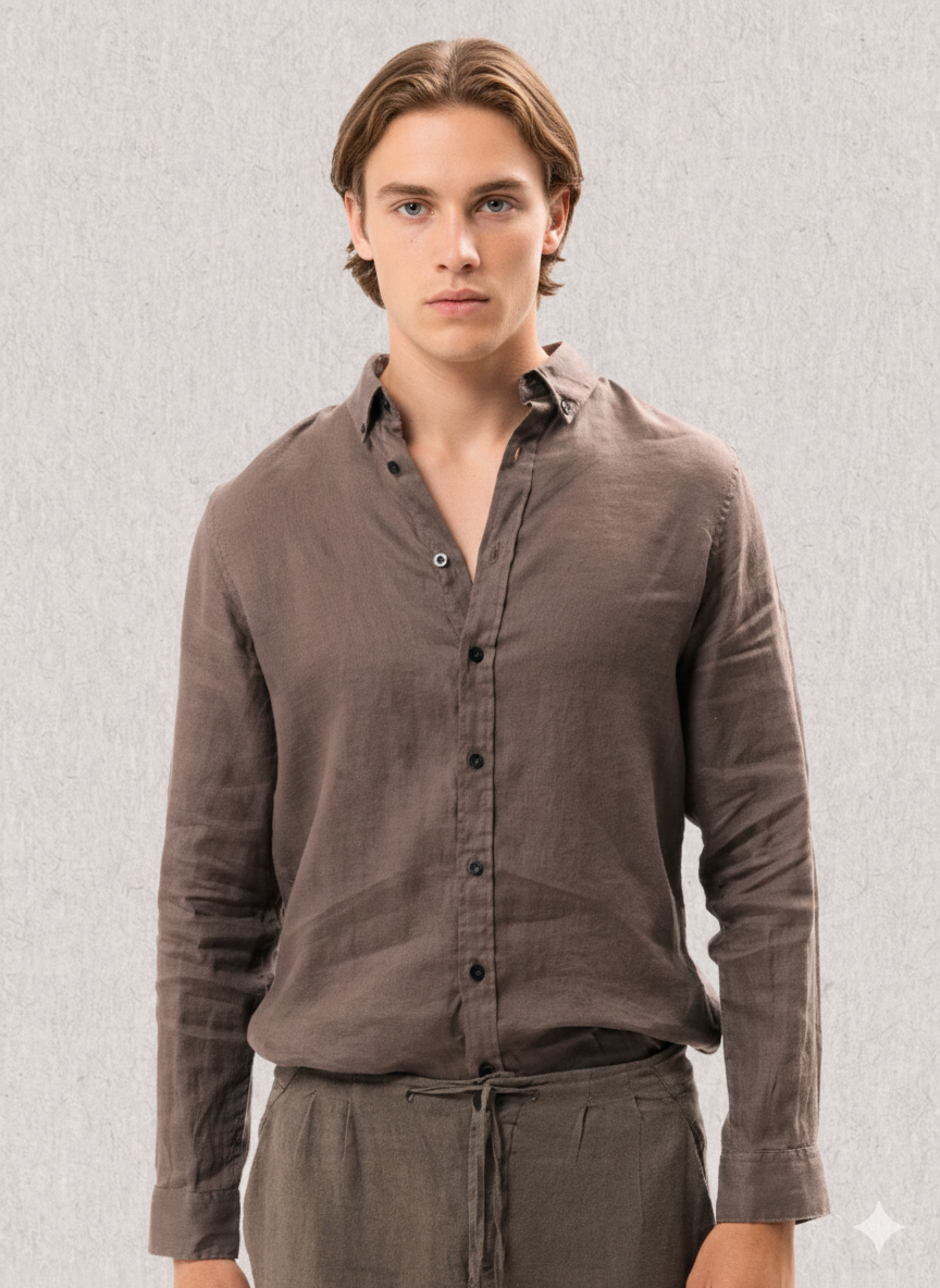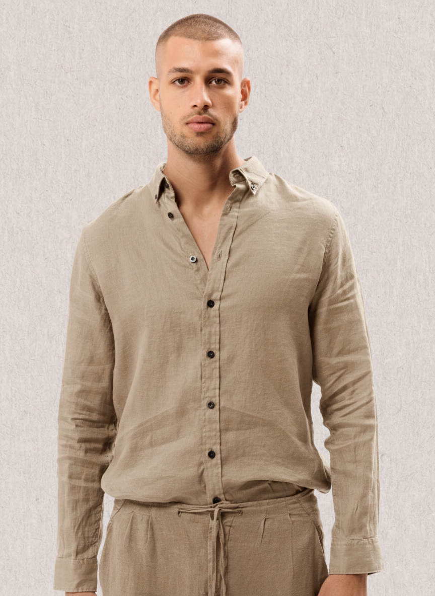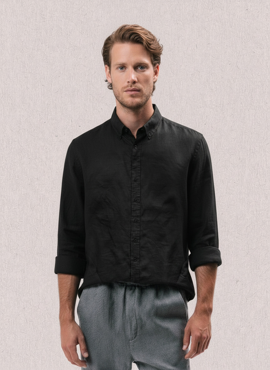A classic reinvented for the modern wardrobe, this button-down linen shirt features a traditional pointed collar and a clean, structured finish. It offers a sharp look without sacrificing the relaxed comfort essential for sun-drenched days.